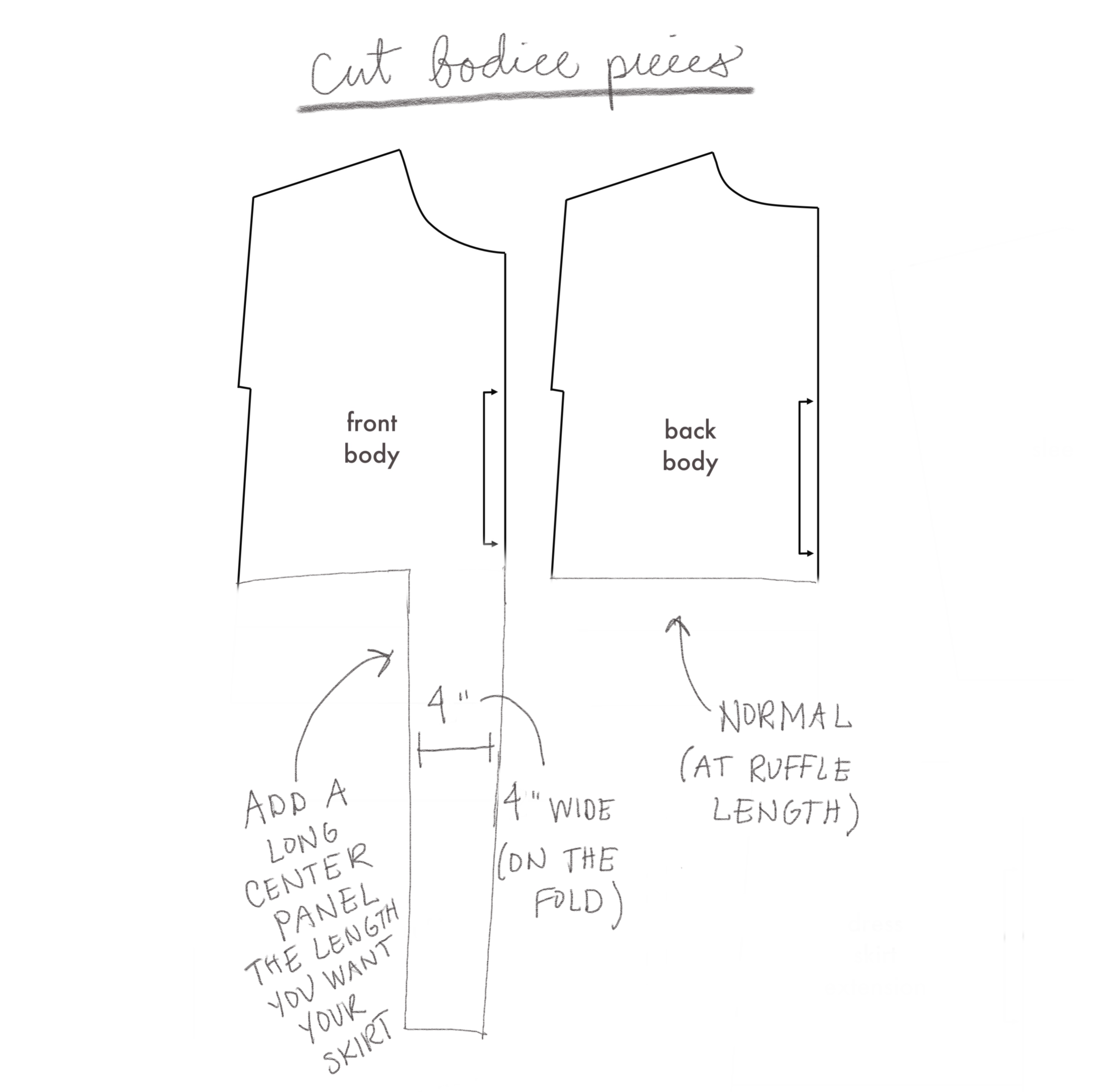 Cut your bodice pieces. You’ll cut the back body bodice piece normally on the fold, cropping it at the ruffle cut line, but the front body bodice piece will have a narrow vertical extension the to make the front bodice the intended length of your dress.